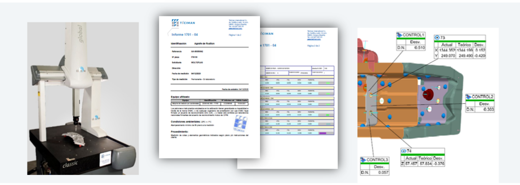 En este tercer informe, los metrólogos de Téciman miden los elementos geométricos (planos de apoyo, orificios de amarre…) y confirman las medidas que estaba dando nuestro cliente. Ambas empresas quedaron conformes con los resultados por lo que se procedió a lanzar el pedido por la serie. Mediante este documento neutral se evita cualquier problema futuro por incompatibilidades en el montaje de las piezas.